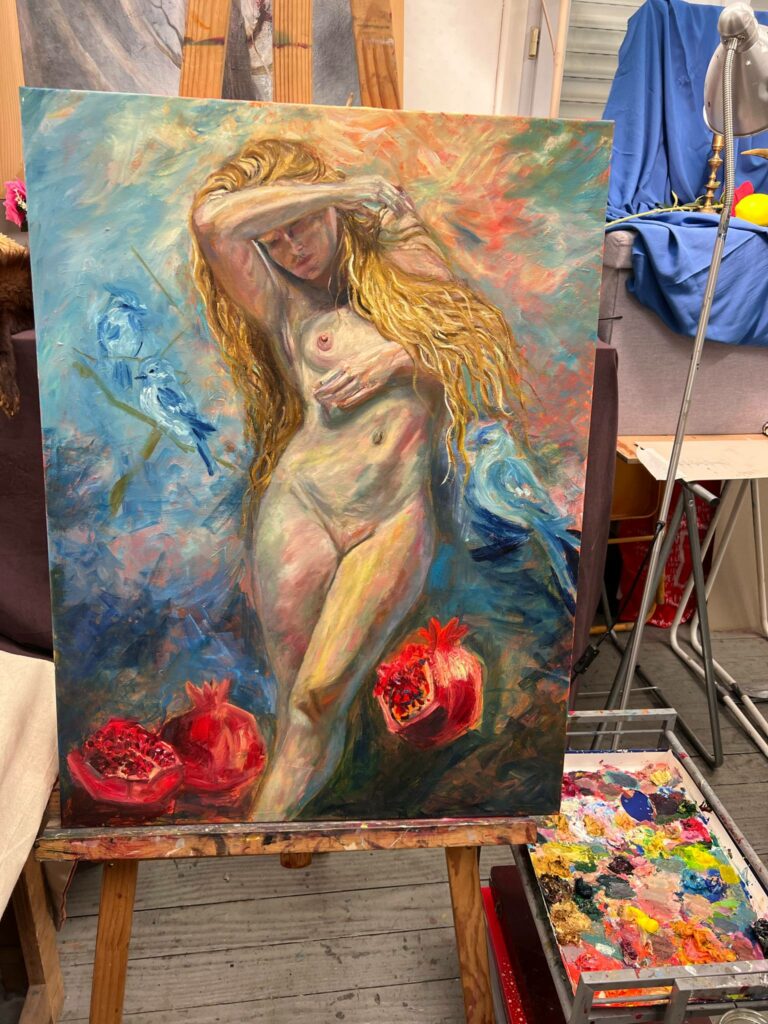 Femmes, mémoire et renaissance — une peinture où le corps devient un territoire sacré, où la lumière traverse la blessure, et où la nature murmure par les grenades et les oiseaux bleus.